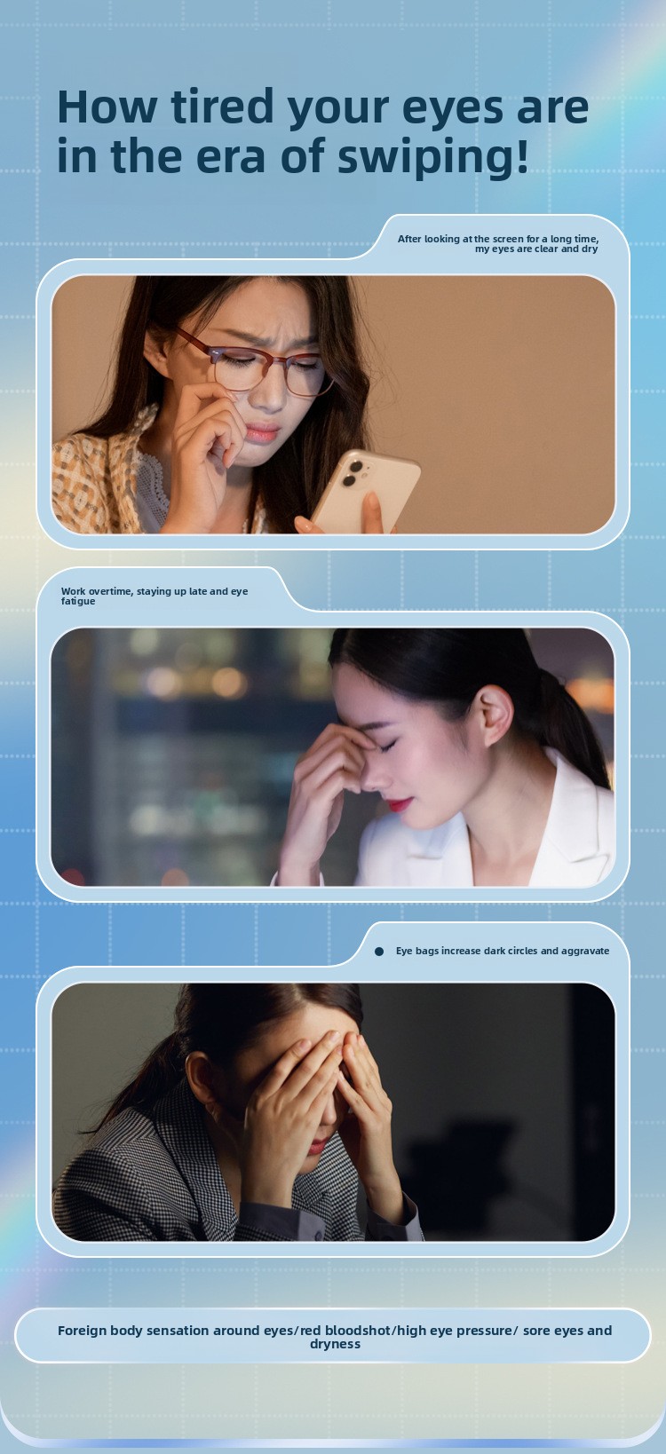 Enjoy customizable massage modes featuring airbag pressing and targeted point shock massage. These techniques gently stimulate key areas around the eyes to reduce pressure and restore freshness.