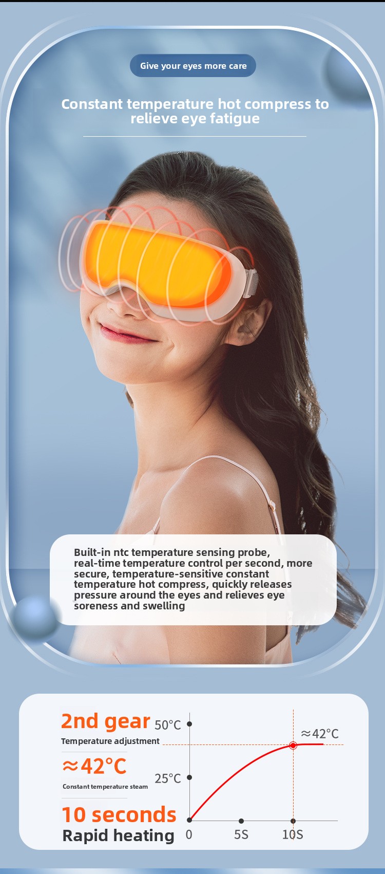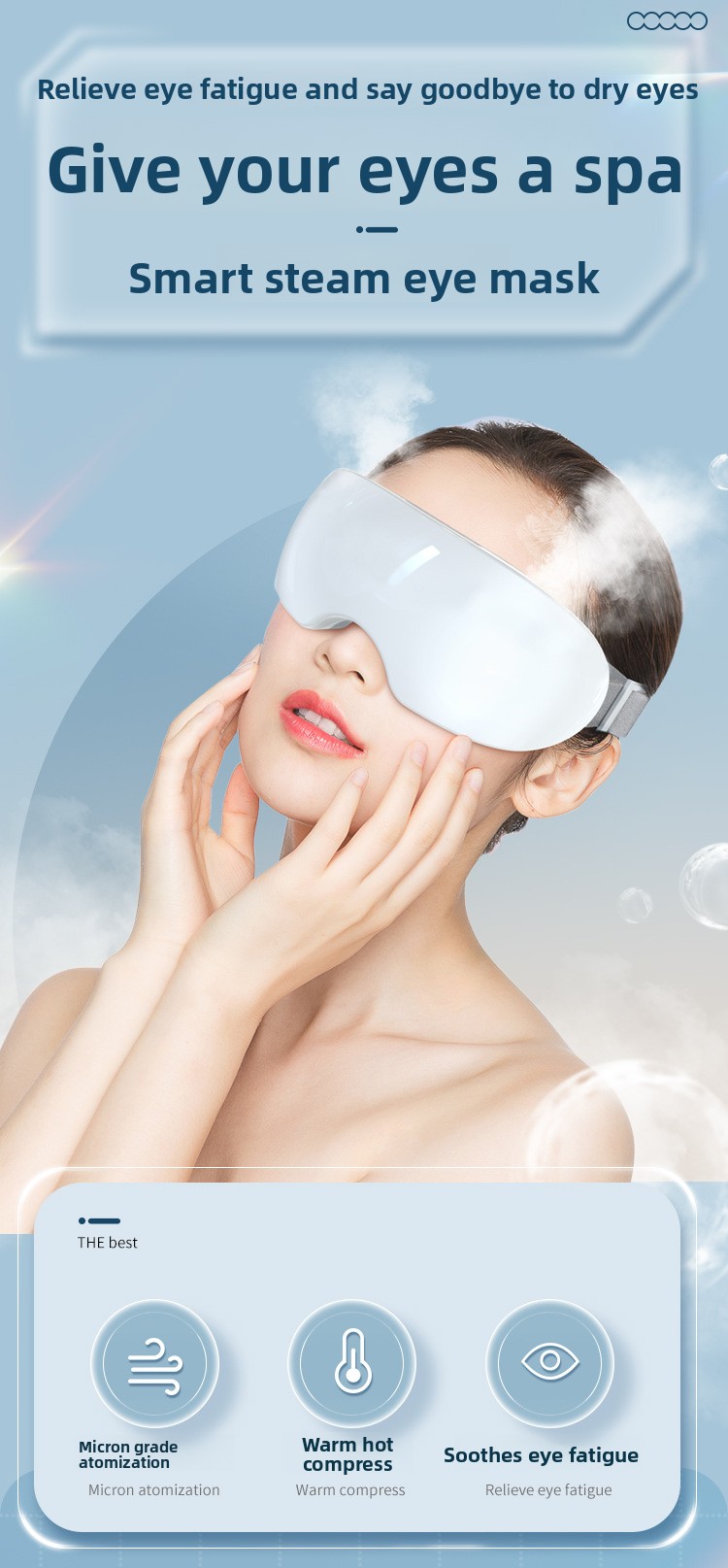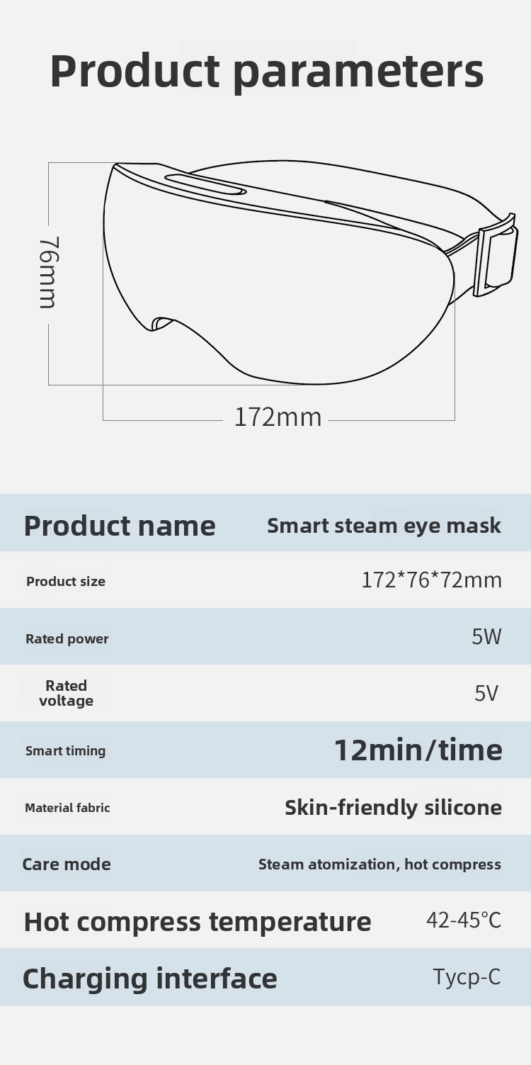 The built-in steam and hot compress system delivers consistent, comfortable warmth to improve circulation around the eyes. Perfect for relaxing tight eye muscles, reducing dryness, and promoting deep relaxation.
